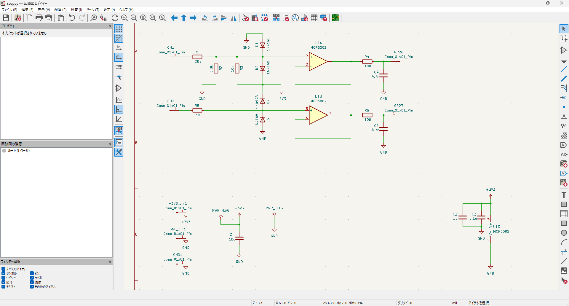 オペアンプはMCP6002を選定した。GBWは1 MHzで、バッファとして使うだけなのでおそらく十分。
