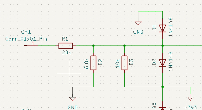 ダイオードは電圧レンジ範囲外の入力からオペアンプを保護します。その後、バッファしてからADC入力へ。