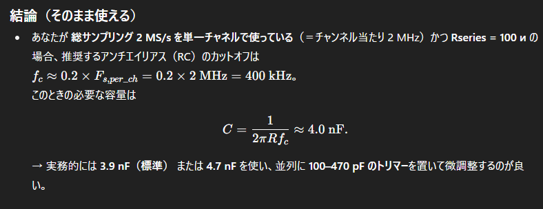 また、ADC入力直前ののR=100 Ω, C=4.7 nF はローパスフィルタ。ADCの測定可能周波数の上限以上の高周波が入力されるとノイズになるので、ここで減衰させます。