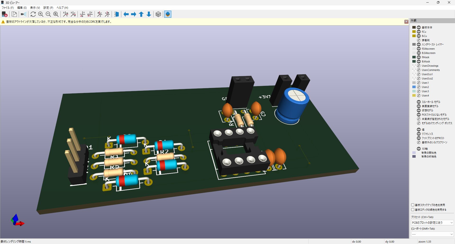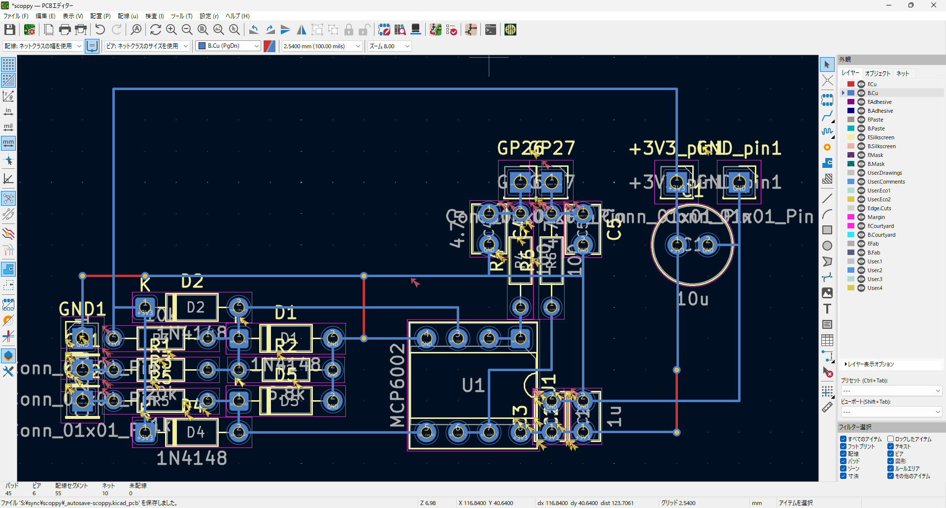 あんまりKiCadの本来の使い方じゃない気がするけど、ユニバーサル基板の配線を事前に決めておくと便利