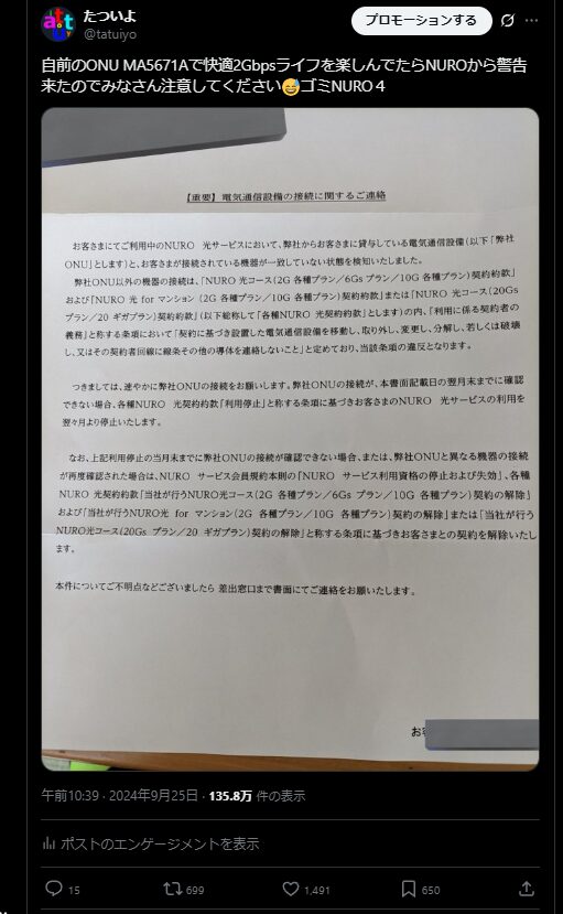 技術的な危険性: 引用リツイートにある通り、PONネットワークにおいて規格外の機器を接続することは、同一の光ファイバーを共有する**他の契約者の通信を妨害する(最悪の場合、物理的にダウンさせる)**現実的なリスクを伴います。